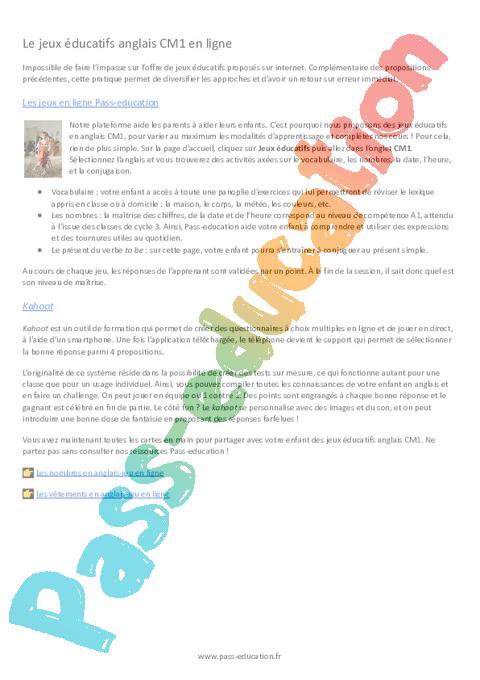 Les jeux en ligne Pass-educationNotre plateforme aide les parents à aider leurs enfants. C’est pourquoi nous proposons des jeux éducatifs en anglais CM1, pour varier au maximum les modalités d’apprentissage et compléter nos cours ! Pour cela, rien de plus simple. Sur la page d’accueil, cliquez sur Jeux éducatifs puis allez dans l’onglet CM1. Sélectionnez l’anglais et vous trouverez des activités axées sur le vocabulaire, les nombres, la date, l’heure, et la conjugaison.