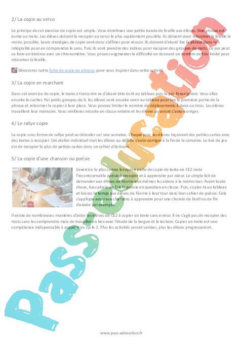 Comment faire progresser les élèves de CE2 en copie de texte ?Il n’y a pas de secret, pour copier sans faute et avec facilité, l’entraînement est le moyen d’y arriver. En lien avec vos séances de lecture-compréhension et d’écriture, les textes à copier en CE2 doivent faire l’objet d’exercices réguliers. Les élèves progressent aussi grâce à l’apprentissage des mots par cœur comme pour les dictées. S’ils connaissent déjà l’orthographe des mots, ils n’auront plus besoin de regarder le modèle donné pour savoir comment ils s’écrivent. La mémorisation est donc une compétence indispensable à travailler pour apprendre à copier des phrases sans erreur.