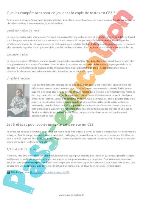 Les 5 étapes pour copier un texte sans erreur en CE2Pour donner du sens à l’exercice de copie, il est recommandé de le lier au travail de lecture-compréhension et d’étude de la langue. Avec le temps, les élèves auront mémorisé l’orthographe de nombreux mots vus dans les textes. Un élève de début de CE2 (donc de fin de CE1) doit savoir copier un texte court de cinq lignes en moyenne. Voici 5 étapes pour aider les élèves à copier un texte sans faute.