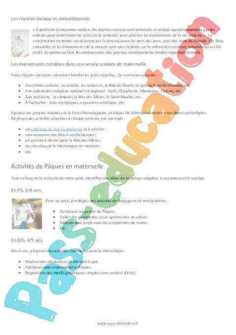 Repères temporels au cycle 1 : Pâques et les autres fêtes La construction du temps chez le jeune enfantAvant l’âge de 2 ans, le petit construit ses premières attitudes temporelles. Il perçoit l’arrivée d’événements dans son univers familier. Puis, jusqu’à 4/5 ans, se développent la narration construite et la planification d’actions. Enfin, entre 5 et 10 ans, le jeune intègre le temps conventionnel et historique. Il distingue le passé proche et le passé lointain. Il utilise les unités de mesure associées aux durées.