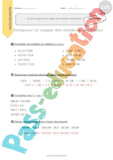 Comment comparer et ranger des nombres décimaux. – CM2 – Exercices avec correction – Cycle 3 – PDF à imprimer