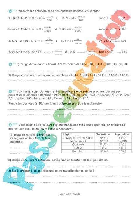 Exercices Correction 6ème Comparer des nombres décimaux pdf