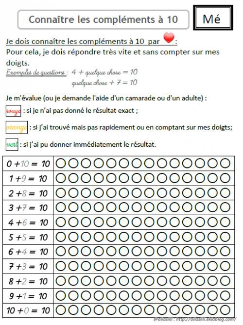 Voici une fiche pour s’entraîner à apprendre les compléments à 10 et s’évaluer.