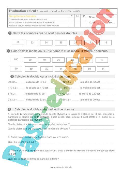 Evaluation pour le Ce2 sur connaître les doubles et les moitiés pdf