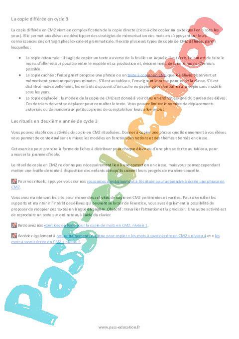 La copie différée en cycle 3La copie différée en CM2 vient en complexification de la copie directe (c’est-à-dire copier un texte que l’on a sous les yeux). Elle permet aux élèves de développer des stratégies de mémorisation des mots en s’appuyant sur leurs connaissances des orthographes lexicale et grammaticale. Il existe plusieurs types de copie de CM2 différée, parmi lesquelles :