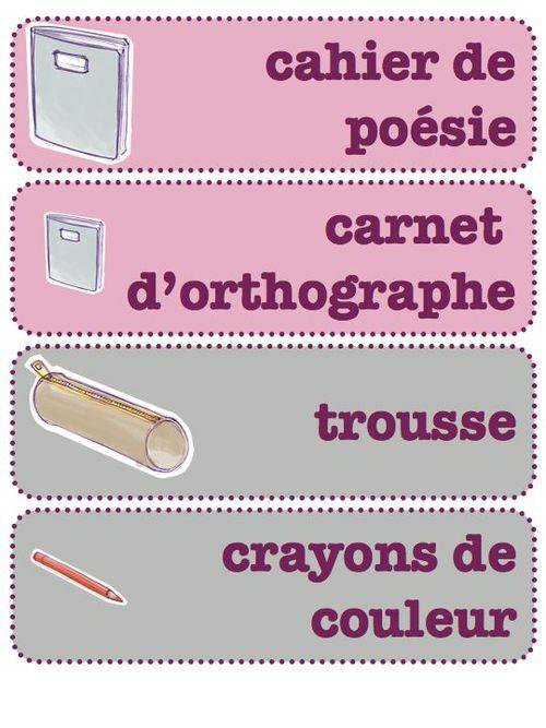 Pour aider les moins autonomes à faire leur cartable et ne rien oublier..., un élève (dont c'est la responsabilité) affiche à côté du tableau les étiquettes du matériel à emporter à la maison.