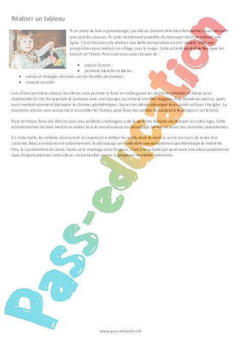 Réaliser un tableauÀ ce stade de leur apprentissage, vos élèves doivent être bien familiarisés avec cet outil que sont les ciseaux. Ils sont maintenant capables de découper droit en suivant une ligne. C’est l’occasion de réaliser une belle composition en arts visuels. Voici une proposition pour réaliser un village sous la neige. Cette activité peut être liée avec un travail sur l’hiver. Pour cela vous aurez besoin de :