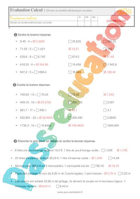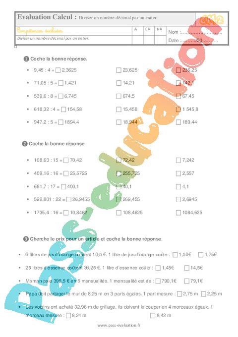 Diviser un nombre décimal par un entier – CM2 – Evaluation en calcul QCM rtf