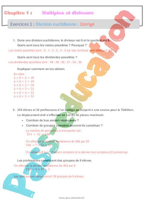 Division euclidienne – 4ème – Révisions – Multiples et diviseurs – Exercices avec correction – Cycle 4 – PDF à imprimer