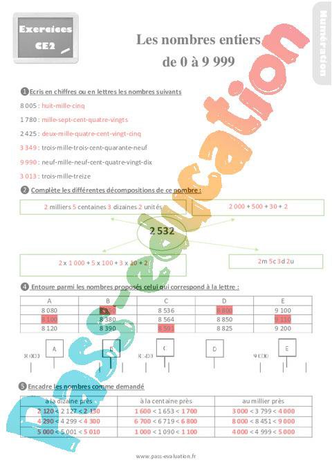 Les nombres de 0 à 9 999 – Ce2 – Exercices – Correction pdf