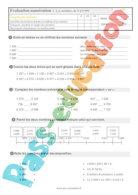 Les nombres de 0 à 9 999 – Ce2 – Evaluation pdf