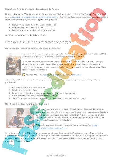 Fiche d’écriture CE1 : nos ressources à télécharger Une fiche pour tracer les minuscules et les majusculesLes séances d’écriture sont quotidiennes pendant les trois premières périodes de l’année de CE1. En périodes 4 et 5, l’enseignant prévoit 2 séances hebdomadaires minimum.
