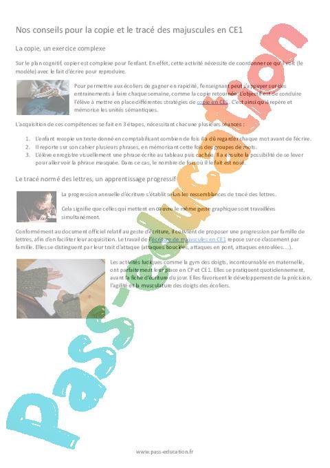 Nos conseils pour la copie et le tracé des majuscules en CE1 La copie, un exercice complexeSur le plan cognitif, copier est complexe pour l’enfant. En effet, cette activité nécessite de coordonner ce qu’il voit (le modèle) avec le fait d’écrire pour reproduire.