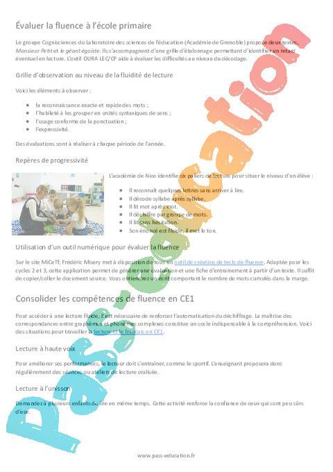 Évaluer la fluence à l’école primaireLe groupe Cognisciences du Laboratoire des sciences de l’éducation (Académie de Grenoble) propose deux textes, Monsieur Petit et le géant égoïste. Ils s’accompagnent d’une grille d’étalonnage permettant d’identifier un retard éventuel en lecture. L’outil OURA LEC/CP aide à évaluer les difficultés au niveau du décodage.