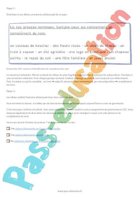 Grammaire CE2 : exercice d’identification du complément du nomLe travail est individuel. Afin de soutenir les élèves les plus fragiles, suggérez-leur d’entourer les prépositions. Procédez à une correction collective. Pour chaque groupe nominal, l’enfant interrogé nomme le nom noyau et son déterminant. Puis, il analyse ce qui le complète : un mot ➡ adjectif, plusieurs mots commençant par une préposition ➡ complément du nom.