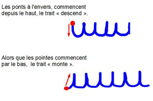 Ce ne sont pas des "ponts à l'envers", car le geste ne part pas du haut, ce sont "des pointes", car le geste part du bas, monte, puis redescend. C'est le même geste que pour faire une série de boucles, sauf qu'on a tellement rétréci la boucle, qu'elle forme des petits pointus.