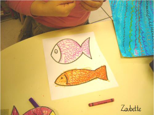 2) des poissons aux écailles faites au feutre et coloriés ensuite aux crayons à la cire :