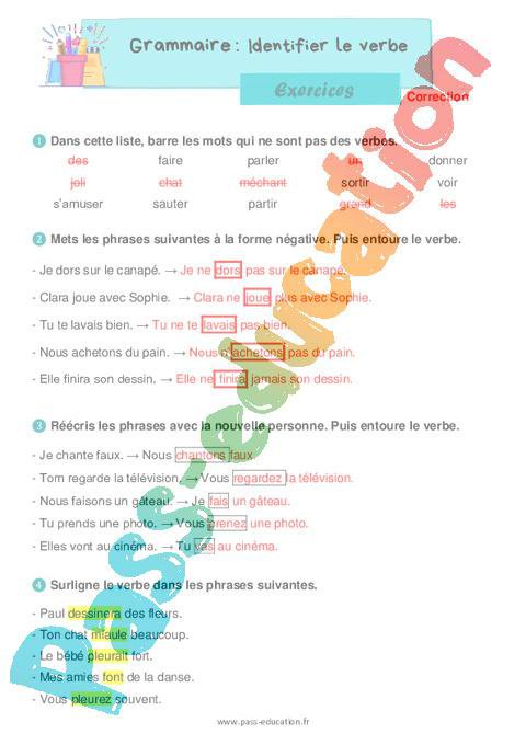 Exercices avec les corrections pour le ce1 sur identifier le verbe.