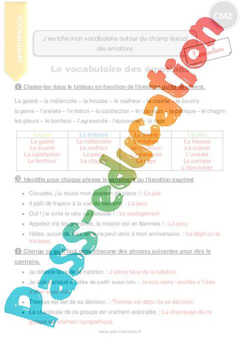 J’enrichis mon vocabulaire autour du champ lexical des émotions. – CM2 – Exercices avec correction – Cycle 3 – PDF à imprimer