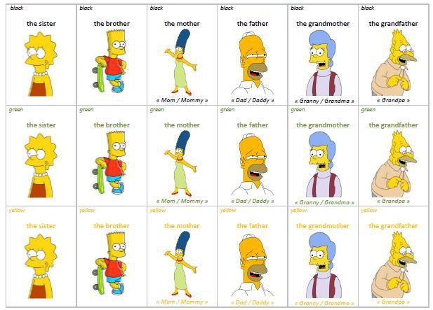 Jeu de 7 familles basé sur les couleurs et les personnes des Simpsons pour apprendre le vocabulaire de la famille.