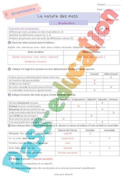 Évaluation de grammaire avec la correction sur la nature des mots en 6ème.