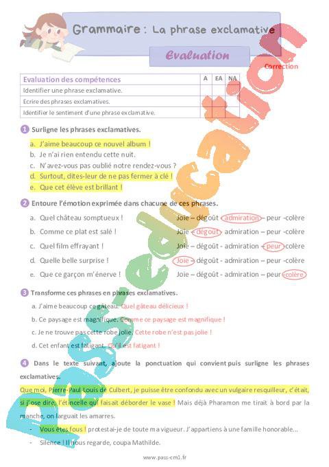 Évaluation de grammaire avec la correction sur : La phrase exclamative – cm1.