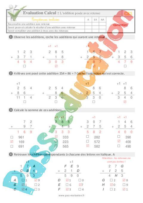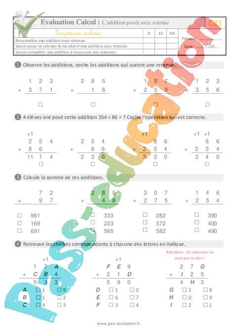 L’addition posée avec retenue au Ce1 – Evaluation: QCM – Quiz – Cycle 2 – PDF à imprimer