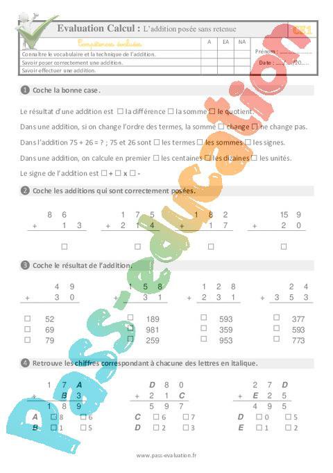 L’addition posée sans retenue au Ce1 – Evaluation: QCM – Quiz – Cycle 2 – PDF à imprimer