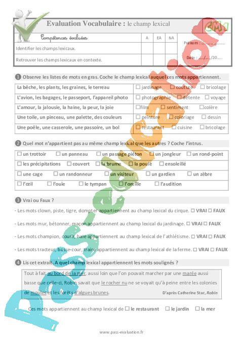 Le champ lexical au Cm1 – Evaluation: QCM – Quiz – Cycle 3 – PDF à imprimer