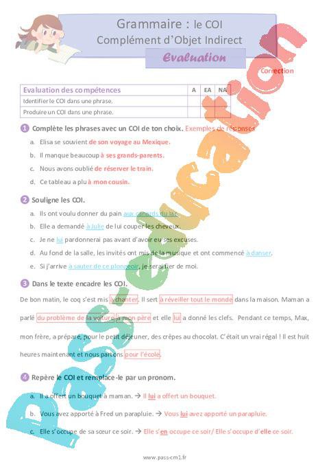 Correction évaluation Cm1 Le COI complément d’objet indirect pdf