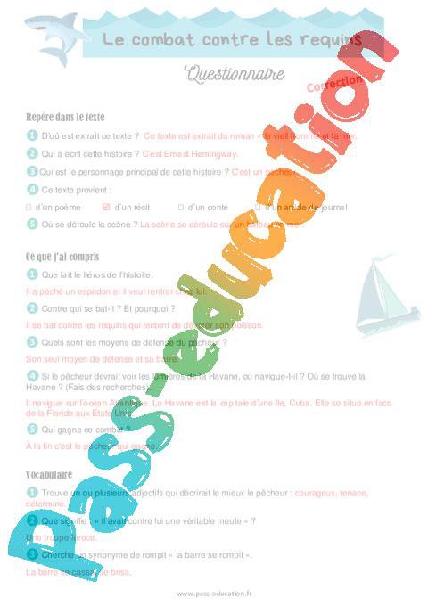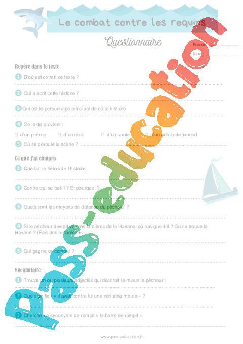 Le combat contre les requins – Cm1 – Cm2 – Questionnaire pdf