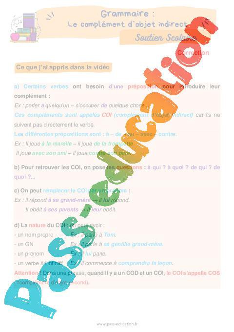 Le complément d’objet indirect (COI) – Cm1 – Soutien scolaire Correction pdf