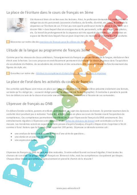 L’étude de la langue au programme de français 3èmeComme pour les niveaux de classe antérieurs, l’enseignement du français passe par l’étude de la langue, réalisée en lien étroit avec la lecture. Le cours propose en enrichissement permanent du lexique. La classe progresse dans l’acquisition du vocabulaire du théâtre, du vocabulaire des émotions et des sensations. Elle poursuit l’étude du fonctionnement des figures de style, etc.