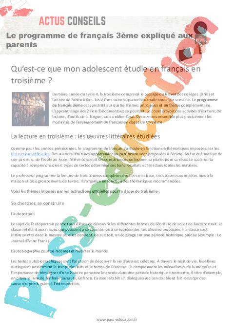 La lecture en troisième : les œuvres littéraires étudiéesComme pour les années précédentes, le programme de français s’articule en fonction de thématiques imposées par les Instructions officielles. Des œuvres littéraires appartenant au patrimoine sont proposées à l’étude. Au fur et à mesure de son parcours, de l’école au lycée, l’élève construit ses compétences de lecture, capitales pour sa réussite scolaire. Sa capacité à comprendre divers types de textes détermine ses bons résultats et ceci dans toutes les matières.