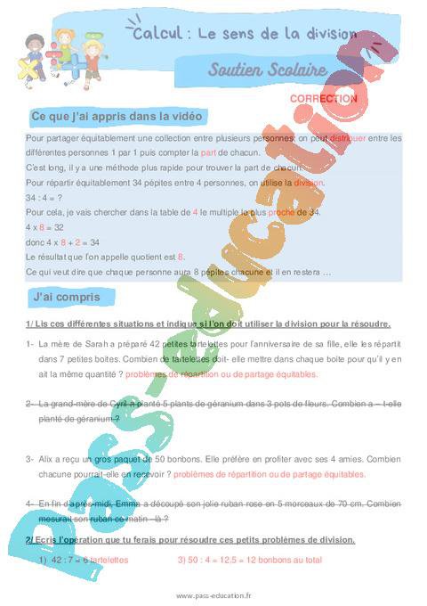 Le sens de la division – CM2 – Soutien scolaire Correction pdf