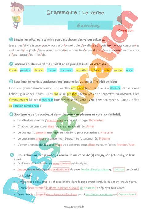 Exercices de grammaire avec la correction sur : Le verbe – Cm1.