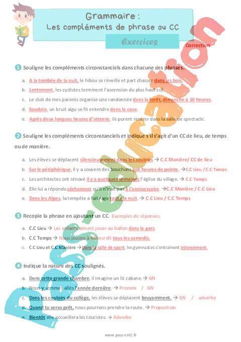 Exercices de grammaire avec la correction sur : Les compléments de phrase ou CC – Cm1.