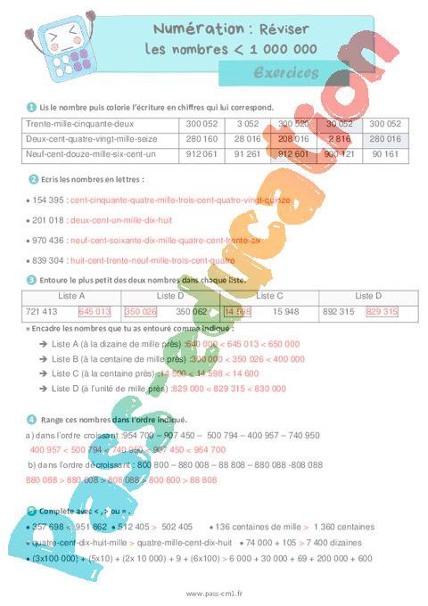Exercices de numération avec la correction sur les nombres inférieurs à 1 000 000 (révision) – Cm1.