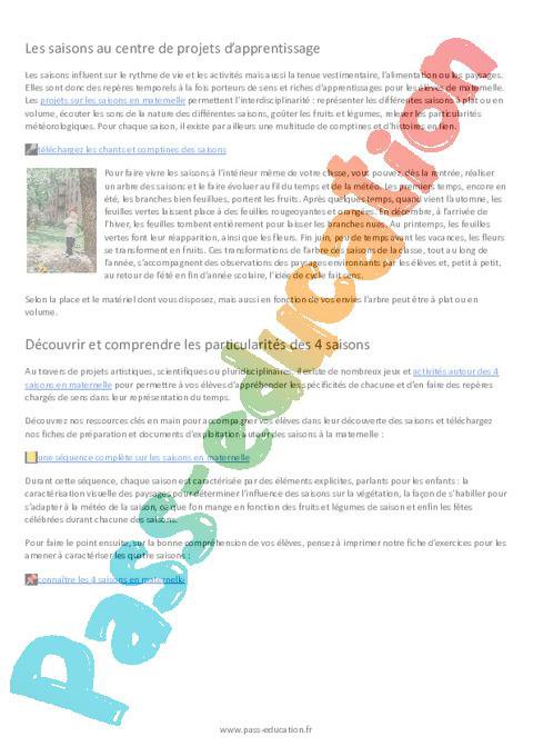Les saisons au centre de projets d’apprentissageLes saisons influent sur le rythme de vie et les activités mais aussi la tenue vestimentaire, l’alimentation ou les paysages. Elles sont donc des repères temporels à la fois porteurs de sens et riches d’apprentissages pour les élèves de maternelle. Les projets sur les saisons en maternelle permettent l’interdisciplinarité : représenter les différentes saisons à plat ou en volume, écouter les sons de la nature des différentes saisons, goûter les fruits et légumes, relever les particularités météorologiques. Pour chaque saison, il existe par ailleurs une multitude de comptines et d’histoires en lien.