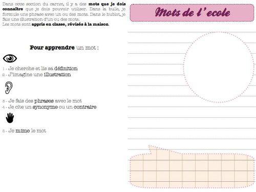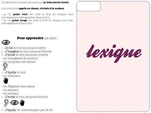 Je ferai noter aux élèves sur les pages consacrées, les mots du mur de mots, classés, compléter les termes issus des séances de recherche pour questionner le monde, les mots surlignés en séance de littérature.