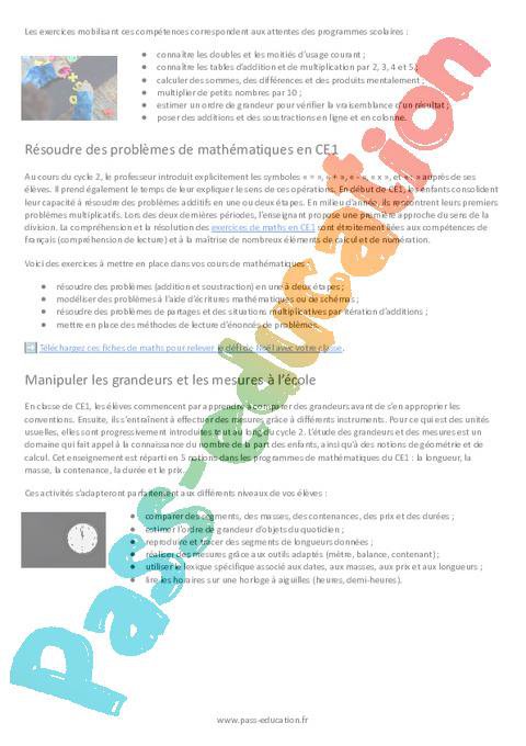 Au cours du cycle 2, le professeur introduit explicitement les symboles « = », « + », « - », « x », et « : » auprès de ses élèves. Il prend également le temps de leur expliquer le sens de ces opérations. En début de CE1, les enfants consolident leur capacité à résoudre des problèmes additifs en une ou deux étapes. En milieu d’année, ils rencontrent leurs premiers problèmes multiplicatifs. Lors des deux dernières périodes, l’enseignant propose une première approche du sens de la division. La compréhension et la résolution des exercices de maths en CE1 sont étroitement liées aux compétences de français (compréhension de lecture) et à la maîtrise de nombreux éléments de calcul et de numération.