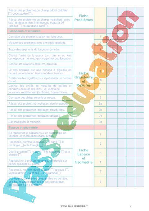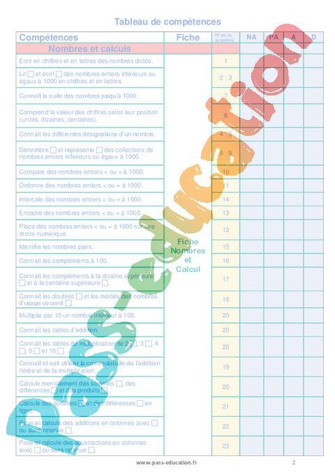 CompétencesNombres et calculs Ecrit en chiffres et en lettres des nombres dictés.Lit et écrit des nombres entiers inférieurs ou égaux à 1000 en chiffres et en lettres.Connaît la suite des nombres jusqu’à 1000.Comprend la valeur des chiffres selon leur position (unités, dizaines, centaines).Connaît les différentes désignations d’un nombre.Dénombre et représente des collections de nombres entiers inférieurs ou égaux à 1000.Compare des nombres entiers < ou = à 1000.Ordonne des nombres entiers < ou = à 1000.Intercale des nombres entiers < ou = à 1000.Encadre des nombres entiers < ou = à 1000.Place des nombres entiers < ou = à 1000 sur une droite numérique.Identifie les nombres pairs.Connaît les compléments à 100.Connaît les compléments à la dizaine supérieure et à la centaine supérieure .Connaît les doubles et les moitiés des nombres d’usage courant .Multiplie par 10 un nombre inférieur à 100.Connaît les tables d’addition.Connaît les tables de multiplication de 2 , 3 , 4 , 5 et 10 .Connaît et sait utiliser la commutativité de l’addition itérée et de la multiplication.Calcule mentalement des sommes , des différences et des produits .Calcule des sommes et des différences en ligne.Pose et calcule des additions en colonnes avec ou sans retenue .Pose et calcule des soustractions en colonnes avec ou sans retenue .Résout des problèmes du champ additif (addition , soustraction ).Résout des problèmes du champ multiplicatif avec des nombres entiers inférieurs ou égaux à 30 (produit , valeur d’une part ).Grandeurs et mesuresCompare des segments selon leur longueur.Mesure des segments avec une règle graduée.Trace des segments de longueur donnée.Choisit l’unité de longueur (cm, dm, m ou km) correspondant le mieux pour exprimer une longueur.Connaît les relations entre cm, dm et m.Lit des horaires sur une horloge à aiguilles en heures entières et en heures et demi-heuresPositionne les aiguilles pour représenter un horaire donné.Connaît les unités de mesures de durées et certaines de leurs relations : jour/semaine,