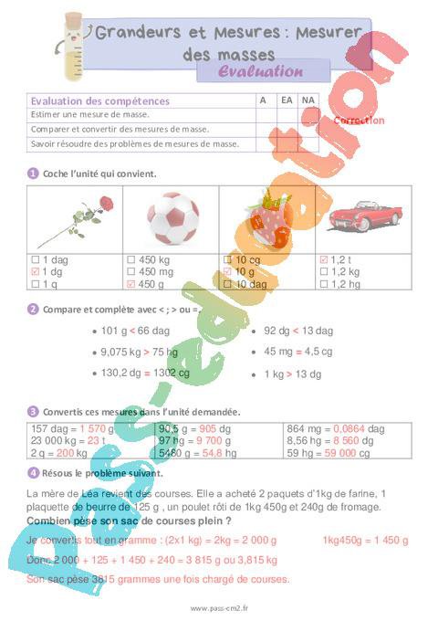 Mesurer des masses – Évaluation de grandeurs et mesures pour le cm2 – Cycle 3 – PDF à imprimer