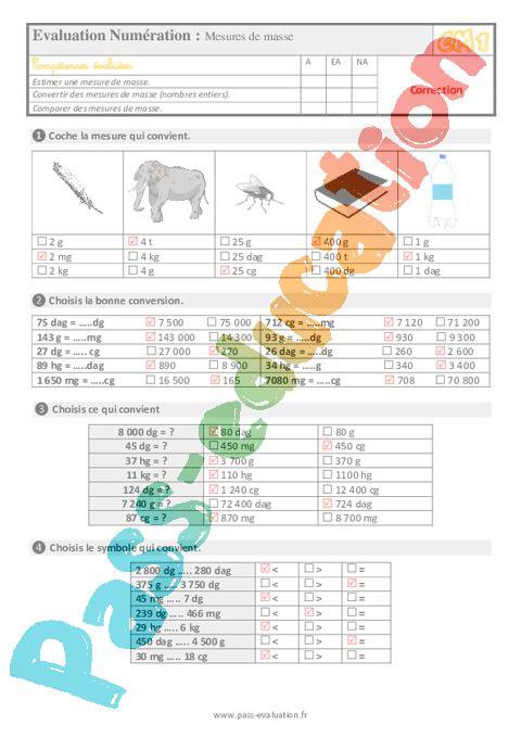 Mesures de masse au Cm1 – Evaluation QCM – Quiz pdf