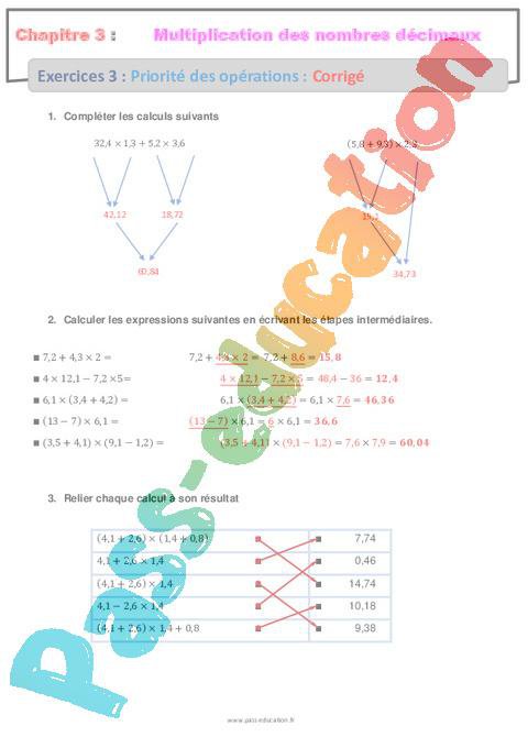 Exercices - Priorité des opérations - 6ème - Multiplication des nombres décimaux - Correction pdf