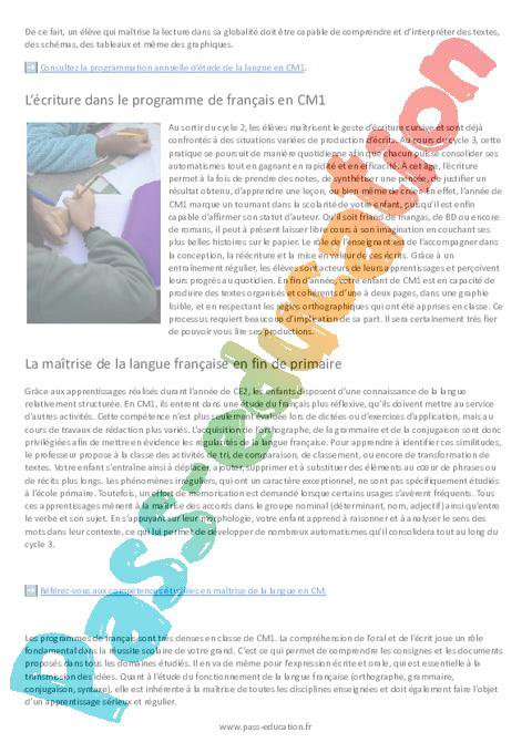 L’écriture dans le programme de français en CM1Au sortir du cycle 2, les élèves maîtrisent le geste d’écriture cursive et sont déjà confrontés à des situations variées de production d’écrits. Au cours du cycle 3, cette pratique se poursuit de manière quotidienne afin que chacun puisse consolider ses automatismes tout en gagnant en rapidité et en efficacité. À cet âge, l’écriture permet à la fois de prendre des notes, de synthétiser une pensée, de justifier un résultat obtenu, d’apprendre une leçon, ou bien même de créer. En effet, l’année de CM1 marque un tournant dans la scolarité de votre enfant, puisqu’il est enfin capable d’affirmer son statut d’auteur. Qu’il soit friand de mangas, de BD ou encore de romans, il peut à présent laisser libre cours à son imagination en couchant ses plus belles histoires sur le papier. Le rôle de l’enseignant est de l’accompagner dans la conception, la réécriture et la mise en valeur de ces écrits. Grâce à un entraînement régulier, les élèves sont acteurs de leurs apprentissages et perçoivent leurs progrès au quotidien. En fin d’année, votre enfant de CM1 est en capacité de produire des textes organisés et cohérents d’une à deux pages, dans une graphie lisible, et en respectant les règles orthographiques qui ont été apprises en classe. Ce processus requiert beaucoup d’implication de sa part. Il sera certainement très fier de pouvoir vous lire ses productions.
