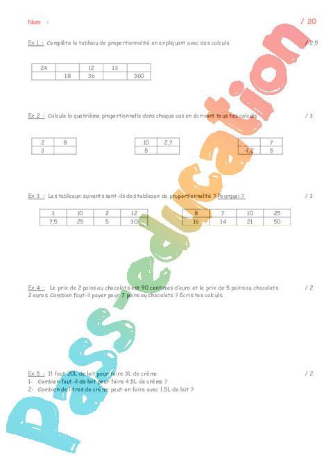 Sujet : Proportionnalité – 5ème – Organisation et gestion des données – Exercices – Contrôle – Mathématiques – Collège