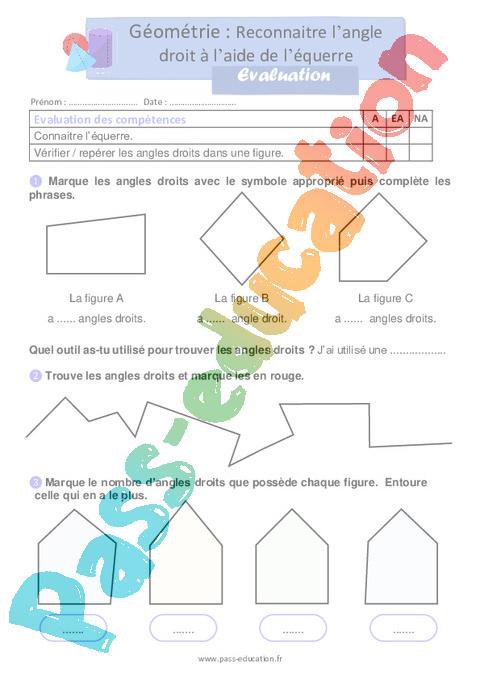 Evaluation CE1 Reconnaitre l’angle droit à l’aide de l’équerre pdf