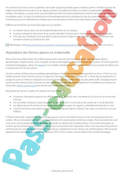 Reproduire des formes planes en maternelleDès la classe de petite section, les enfants apprennent à dessiner de manière approximative quelques figures géométriques simples (cercle, carré, triangle). Ils découvrent également comment tracer leur contour à l’aide de gabarits (matériel pédagogique, pièces de Tangram). Les activités artistiques sont un excellent support pour guider les élèves vers la reproduction de formes planes.