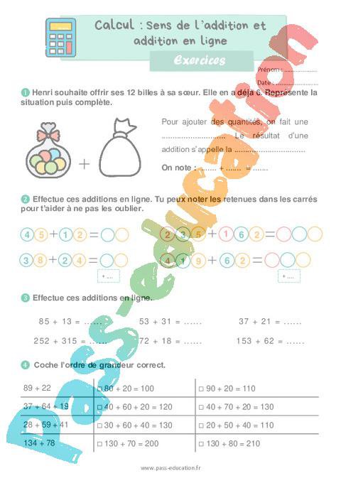 Sens de l’addition et addition en ligne au Ce1 – Exercices, révisions – Cycle 2 – PDF à imprimer